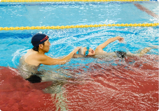 水に慣れることから無理なく始め、水泳の基礎を学びます。4泳法の習得を目指しながら、細分化された級設定により個々に応じた練習で効果的に上達していただけます。また、水の事故から自身の身を守るための安全水泳を段階的に学習します。